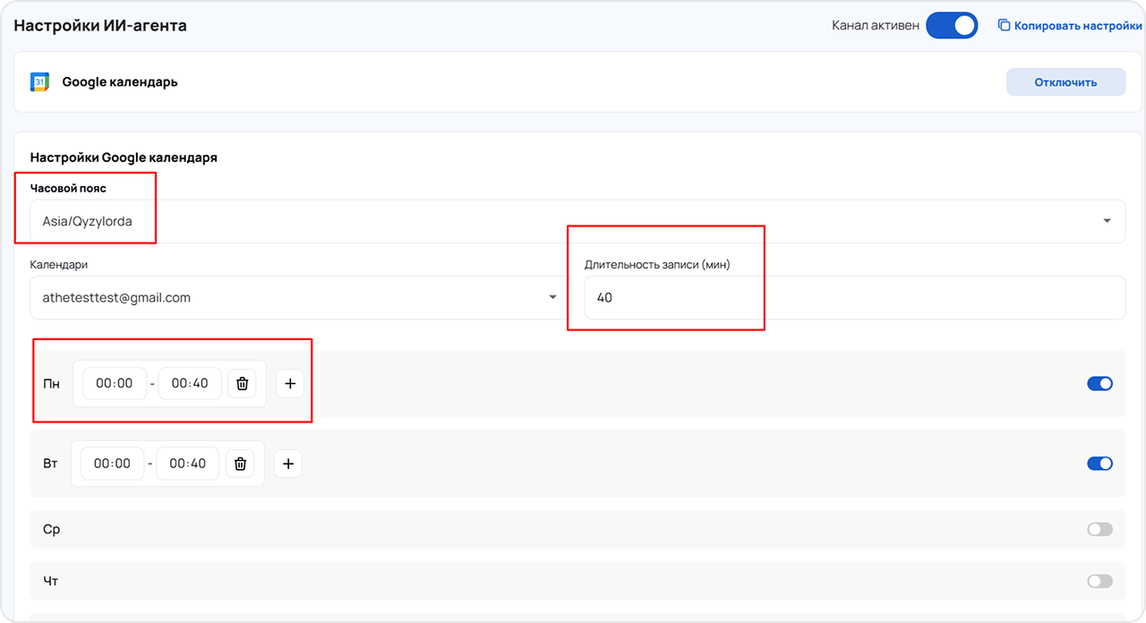 - Интеграция подключена, теперь необходимо задать часовой пояс, длительность встречи, и выбрать возможные промежутки записи в течении недели.